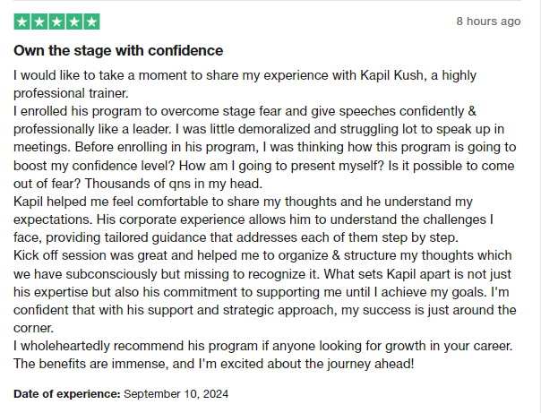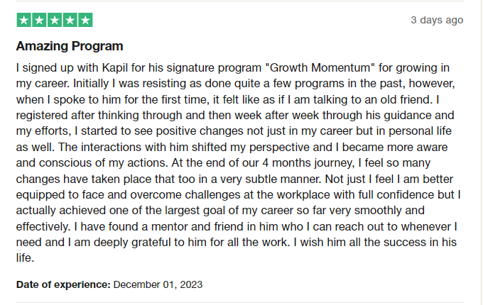 I wholeheartedly recommend Kapil to anyone seeking personal and professional growth through a one-on-one coaching experience.